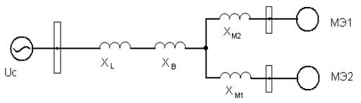Схема замещения аналогична схеме замещения для цепи в VIзоне. Отличие расчета токов КЗ в седьмой зоне состоит в том, что при КЗ на сборных шинах 6кВ или на любом присоединении КЗ, проходящий по этим шинам ток присоединения, будет суммарным: от системы и от асинхронных электродвигателей С.Н. , работающих кратковременно в генераторном режиме.