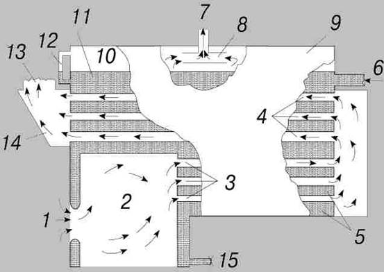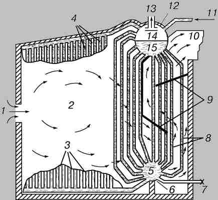 Рис. 3. ДВУХБАРАБАННЫЙ ВЕРТИКАЛЬНЫЙ ВОДОТРУБНЫЙ ПАРОВОЙ КОТЕЛ С ЭКРАНИРОВАННОЙ ТОПКОЙ. 1 - подвод топлива и воздуха; 2 - экранированная (радиационная) топочная камера; 3 - огнеупорная обмазка или металлическая обшивка труб экрана; 4 - трубы экрана; 5 - вода; 6 - цилиндрический водяной барабан; 7 - слив; 8 - вертикальные водяные трубы; 9 - направляющие перегородки; 10 - дымоход к дымовой трубе; 11 - вход воды; 12 - цилиндрический паровой барабан; 13 - выход пара; 14 - пар; 15 - кипящая вода.