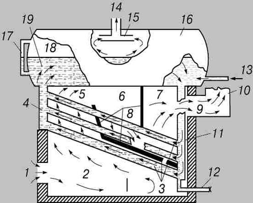 Рис. 2. ПРОДОЛЬНЫЙ ГОРИЗОНТАЛЬНЫЙ ВОДОТРУБНЫЙ ПАРОВОЙ КОТЕЛ. 1 - подвод топлива и воздуха; 2 - огнеупорная топочная камера; 3 - водяные трубы; 4 - передний коллектор (пароводяная смесь); 5 - первый проход; 6 - второй проход; 7 - третий проход; 8 - направляющие перегородки; 9 - дымовой короб; 10 - дымоход к дымовой трубе; 11 - задний коллектор (вода); 12 - слив; 13 - вход воды; 14 - выход пара; 15 - сепаратор пара; 16 - барабан; 17 - водомерное стекло; 18 - пар; 19 - пароводяная смесь.
