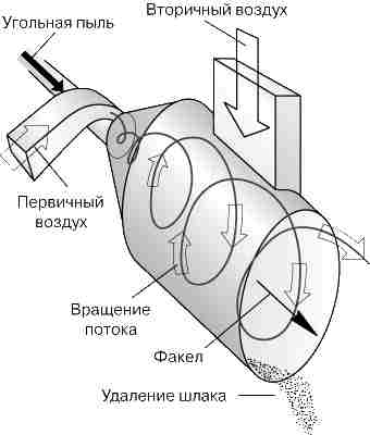 Топливо. Обычное твердое топливо (каменный уголь или дрова) располагается в виде горящего слоя на колосниковой решетке. Воздух пронизывает этот слой через возникающие сами по себе каналы в измельченном топливе. Если уголь коксуется, размягчаясь и частично спекаясь, то приходится время от времени его перемешивать, что способствует образованию новых и устранению слишком широких старых каналов. Так называемое подвижное топливо (угольная пыль, мазут или топливный газ) вводится в топку горелкой, в которой струя топлива смешивается с сильно закрученным потоком воздуха. Например, угольная пыль сначала подхватывается потоком первичного воздуха, которого, вообще говоря, недостаточно для полного сгорания. Горелка придает этому вращающемуся потоку форму узкого конуса. Затем к нему подводится полный поток вторичного воздуха, и конус дополнительно закручивается (рис. 4).