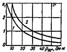 Рис. 1. Залежність коефіцієнта К1 , від питомого електричного опору води при температурі 20 о С для водонагрівників: 1 — ЭПЗ-100И2; 2 — ЭПЗ-100/0,4