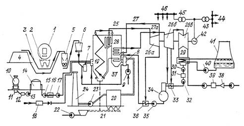 Подогретый пар из выходного коллектора пароперегревателя по паропроводу свежего пара 25 поступает в цилиндр высокого давления (ЦВД) паровой турбины 26а. После ЦВД пар по «холодному» паропроводу промежуточного перегрева 27 возвращается в котел и поступает в промежуточный пароперегреватель 28, в котором перегревается вновь до температуры свежего пара или близкой к ней. По «горячей» линии промежуточного перегрева 27а пар поступает к цилиндру среднего давления. (ЦСД) 26б, затем — в цилиндр низкого давления (ЦНД) 26в и из него — в конденсатор турбины 29. Из конденсатосборника конденсатора конденсатные насосы I ступени 30 подают конденсат на фильтры установки очистки конденсата 31, после которой конденсатным насосом второй ступени 32 конденсат прокачивается через группу подогревателей низкого давления (ПНД) 33 в деаэратор 34. В деаэраторе вода доводится до кипения и при этом освобождается от растворенных в ней агрессивных газов О3 и СО2 , что предотвращает коррозию в пароводяном тракте. Деаэрированная питательная вода из аккумуляторного бака деаэратора, питаемого насосом 35, подается через группу подогревателей высокого давления (ПВД) 36 в экономайзер 37. Тем самым замыкается пароводяной тракт, включающий в себя пароводяные тракты котла и турбинной установки.