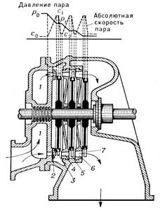 Схематический продольный разрез активной турбины с тремя ступенями давления: 1 — кольцевая камера свежего пара; 2 — сопла первой ступени; 3 — рабочие лопатки первой ступени; 4 — сопла второй ступени; 5 — рабочие лопатки второй ступени; 6 — сопла третьей ступени; 7 — рабочие лопатки третьей ступени.