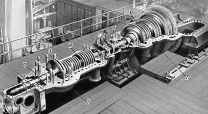 Двухкорпусная паровая турбина (со снятыми крышками): 1 — корпус высокого давления; 2 — лабиринтовое уплотнение; 3 — колесо Кертиса; 4 — ротор высокого давления; 5 — соединительная муфта; 6 — ротор низкого давления; 7 — корпус низкого давления.