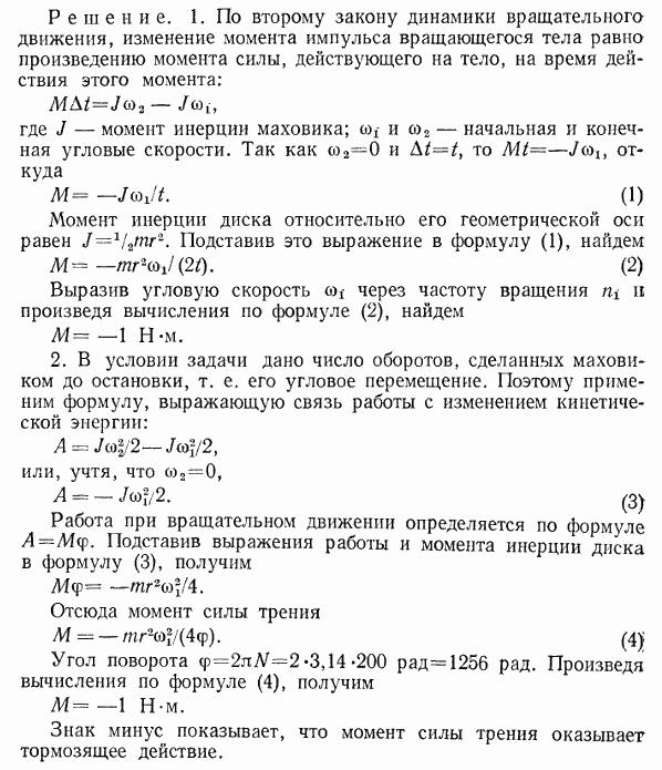 Маховик в виде диска массой m=50 кг и радиусом r=20 см был раскручен до частоты вращения n1=480 мин-1 и затем предоставлен самому себе. Вследствие трения маховик остановился. Найти момент M сил трения, считая его постоянным для двух случаев: 1) маховик остановился через t=50 с; 2) маховик до полной остановки сделал N=200 оборотов.