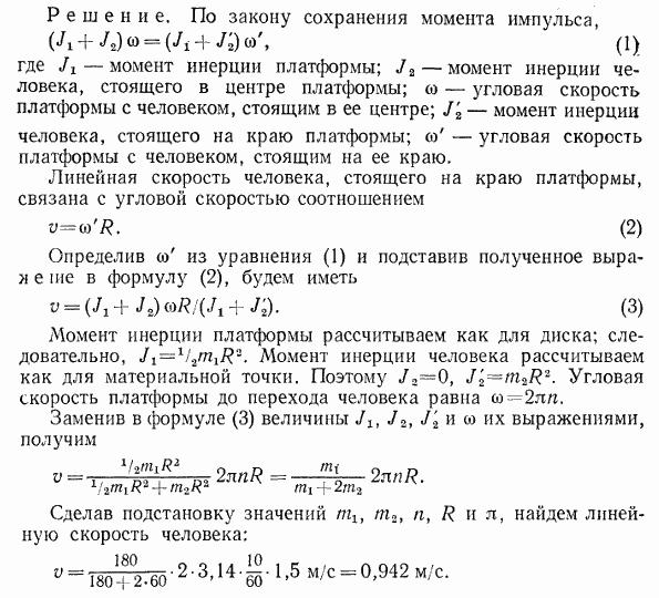 Платформа в виде диска радиусом R=1,5 м и массой m1=180 кг вращается по инерции около вертикальной оси с частотой n=10 мин-1. В центре платформы стоит человек массой m2=60 кг. Какую линейную скорость относительно пола помещения будет иметь человек, если он перейдет на край платформы?