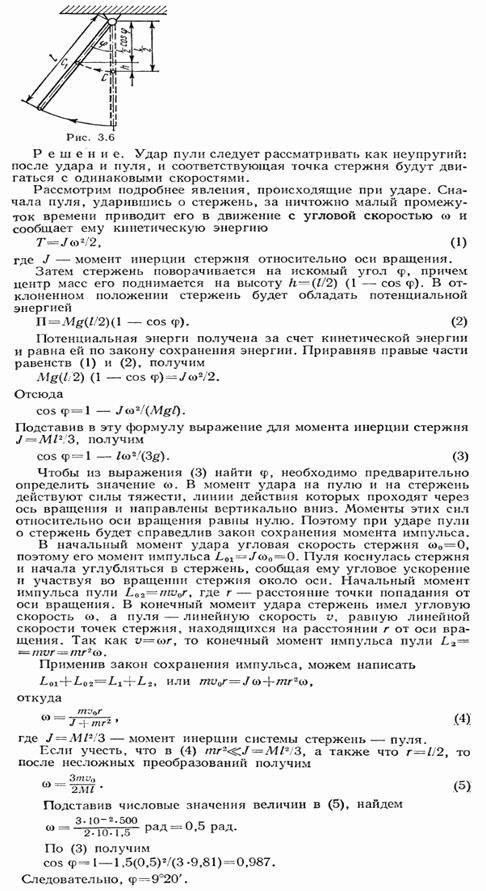 Стержень длиной l=1,5 м и массой M=10 кг может вращаться вокруг неподвижной оси, проходящей через верхний конец стержня (рис. 3.6). В середину стержня ударяет пуля массой m=10 г, летящая в горизонтальном направлении со скоростью v0=500 м/с, и застревает в стержне. На какой угол φ отклонится стержень после удара?