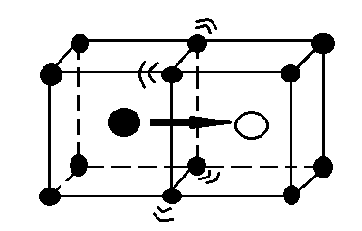 Міжвузільний механізм – це переходи атома з одного міжвузілля в інше. Для такого переходу мігруючому атому потрібно «протиснутися» через ворота, утворені сусідніми атомами. (рис. 2.2.1), тому міжвузьльний механізм характерний для водню, вуглецю та інших легких елементів.