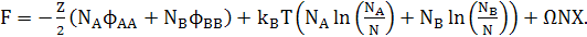 NA і NB - кількість атомів двох видів, і N=NA +NB . Перший доданок – енергія ідеального сплаву (енергетичний доданок), другий – ентропія змішування, і останній – додаткова енергія неідеального сплаву. Це рівняння справедливе для будь-яких конфігурацій атомів. Для регулярних розчинів, припущено що А і В атоми рандомно розподілені, тоді Х, який залежить від розподілу атомів, дорівнює CA CB , де СА =NA /N, і CB =NB /N.