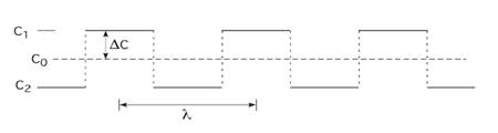 Для альтернативних шарів двох різних концентрацій, розділених стрибкоподібним інтерфейсам, як на рис.3.5.1, де інтерфейси на n/2 атомних відстанях один від одного, тоді λ=nd, повна енергія на атом одного періоду n атомів дорівнює
