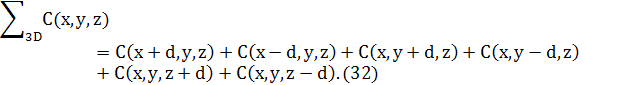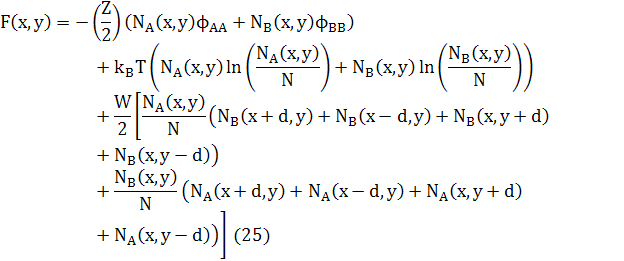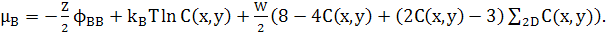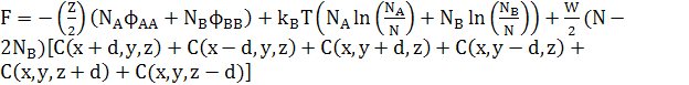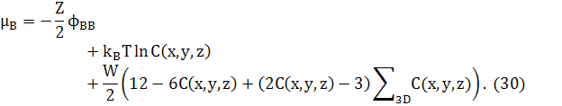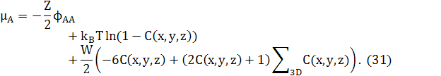 Зауважимо, що останній доданок в обох рівняннях (25) і (29) може бути перетворений в доданок другої похідної, відніманням ZWNC(1−C). Це дасть стандарту форму для вільної енергії твердого розчину плюс доданок другої похідної для змін концентрацій. Відповідні хімічні потенціали в 3D
