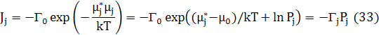 Потік атомів з вузла Ji дорівнює частоті, помноженій на коефіцієнт Больцмана, що містить різницю між хімічним потенціалом чистого компонента (μj * ) та дійсним значенням хімічного потенціалу j-го компонента (μj ).