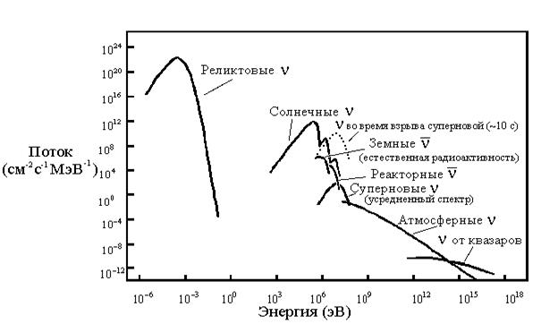 Существуют атмосферные нейтрино – это нейтрино рождающиеся при столкновении космических лучей с ядрами земной атмосферы, а так же нейтрино рождающиеся при бета распаде ядер в атомных реакторах и земные нейтрино. Мы погружены в реликтовые нейтрино (около 500 штук в кубическом сантиметре), появившихся во время Большого Взрыва 15 миллиардов лет назад.