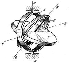 На рис.1 изображен гироскоп, укрепленный в кардановом подвесе. Наружное кольцо А карданова подвеса может свободно поворачиваться вокруг вертикальной оси аа. Внутреннее кольцо Б связано с кольцом А горизонтальной осью бб. В кольце Б укреплен гироскоп Г, ось вращения которого ев перпендикулярна оси бб. Центр тяжести гироскопа находится на пересечении всех трех осей и при любом повороте колец сохраняет свое положение в пространстве.