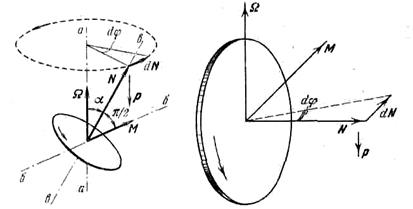 Пусть вначале М =0, а гироскоп вращается с угловой, скоростью , так что N=Jw( J момент инерции гироскопа относительно оси вращения). Если затем к оси гироскопа приложить вертикальную внешнюю силуР, то возникнет момент силМ, лежащий в горизонтальной плоскости. Обратившись к уравнению (1) и рис. 2 и 3, нетрудно понять, что векторы М и N ортогональны друг другу, а векторdN направлен так же, как иМ, поэтому силаР, не изменяя величины вектора /V, заставляет его конец описывать окружность в горизонтальной плоскости. За