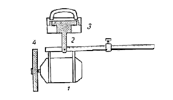 Экспериментальная установка и методика измерения. Гироскоп (рис. 1) представляет собой миниатюрный электромотор 1, подвешенный к горизонтальному стержню. Стержень вместе с гироскопом может вращаться в вертикальной плоскости вокруг оси, укрепленной в вилке 2. Вращение в горизонтальной плоскости происходит вместе с вилкой в подвесе 3. Для увеличения момента инерции мотор снабжен маховиком 4. Мотор питается постоянным током.