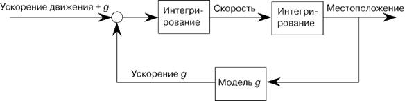 Рис. 1. ИНЕРЦИАЛЬНАЯ НАВИГАЦИОННАЯ СИСТЕМА с обратной связью. Система измеряет кажущееся ускорение (в которое входит ускорение свободного падения g ) и, дважды интегрируя его, находит местоположение, затем с учетом последнего определяет ускорение g и, вычитая его из кажущегося ускорения, находит истинное ускорение движения летательного аппарата или судна.