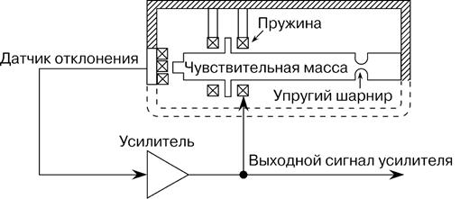 Рис. 2. АКСЕЛЕРОМЕТР . Ускорение движения вызывает отклонение чувствительной массы, закрепленной на упругом шарнире. Сигнал датчика отклонения усиливается и создает пропорциональную ускорению противодействующую силу пружины, приложенную к чувствительной массе, тем самым возвращая сигнал датчика к нулевому значению.