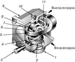 Рис. 2. АВИАЦИОННЫЙ ГИРОУКАЗАТЕЛЬ КУРСА с воздушным приводом. Пример применения трехстепенного гироскопа. Арретир служит для удержания оси собственного вращения ротора в горизонтальном положении при вводе азимута по шкале. 1 – основание; 2 – зубчатое колесо синхронизатора; 3 – ручка арретира; 4 – арретир; 5 – шкала азимута; 6 – воздушное сопло; 7 – наружная рамка; 8 – ротор; 9 – корпус; 10 – полуось наружной рамки с фиксаторной гайкой; 11 – внутренняя рамка .