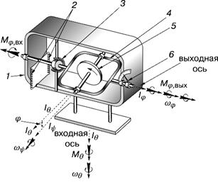 Рис. 3. ДВУХСТЕПЕННЫЙ ГИРОСКОП с противодействующей пружиной, вязкостным демпфером и стрелочным индикатором угловой скорости (вязкостный демпфер служит только для успокоения колебаний). 1 – корпус; 2 – пружины; 3 – вязкостный демпфер; 4 – рамка; 5 – ротор; 6 – указатель выходного угла рамки j .
