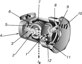 Рис. 4. УКАЗАТЕЛЬ УГЛОВОЙ СКОРОСТИ – авиационный прибор с двухстепенным гироскопом. 1 – регулировка противодействующей пружины; 2 – ось собственного вращения ротора; 3 – рамка; 4 – корпус; 5 – ротор; 6 – воздушное сопло; 7 – турбинный обод ротора; 8 – демпфер рамки; 9 – стрелка; 10 – шкала; 11 – указывающая система; 12 – противодействующая пружина.