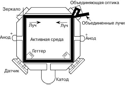 Рис. 3. ЛАЗЕРНЫЙ ГИРОСКОП . Два лазерных луча, генерируемые разрядом между анодами и катодом, распространяются навстречу друг другу в кольцевом резонаторе, образованном зеркалами. Взаимодействуя, лучи дают интерференционную картину в виде системы пятен, по перемещению которой можно определить поворот ротора гироскопа