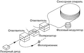 Волоконно-оптический гироскоп (рис. 4) действует по принципу интерферометра Саньяка. Свет в нем направляется по замкнутому пути с помощью оптического волновода. Для увеличения длины оптического пути и повышения чувствительности гироскопа оптическое волокно свернуто в спираль. В волоконно-оптическом гироскопе используется внешний лазерный источник света. И здесь обратное рассеяние остается серьезной проблемой