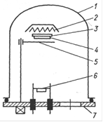 Схема термического напыления. Рабочая камера вакуумной установки представляет собой цилиндрический металлический или стеклянный колпак 1, который устанавливается на опорной плите 7. Между колпаком и плитой находится резиновая прокладка, обеспечивающая вакуумплотное соединение. Внутри рабочей камеры расположены: подложка 4, которая закрепляется на держателе 3, нагреватель подложки 2 испаритель 6 для нагрева напыляемых веществ. Между испарителем и подложкой устанавливается заслонка 5, позволяющая в нужный момент прекращать попадание испаряемого вещества на подложку. Рабочая камера откачивается вакуумным насосом. Остаточное давление под колпаком измеряется специальным прибором - вакуумметром. Давление измеряется в мм рт. ст.