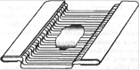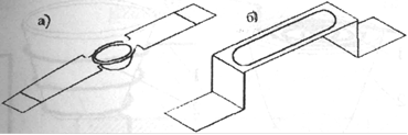 Ленточные испарители применяются для испарения металлов, плохо удерживающихся на проволочных испарителях, а также диэлектриков и изготавливаются с углублениями в виде полусфер, желобков, коробочек или лодочек. Наиболее распространенными материалами для таких испарителей является фольга толщиной 0,1 - 0,3 мм из вольфрама, молибдена и тантала. Испаритель с углублением в виде полусферы, предназначенный для испарения относительно малых количеств вещества, показан на рис.3. а. Испарители лодочного типа (рис.3,6) предназначены для испарения относительно больших количеств вещества.