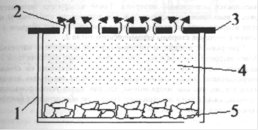 Если для металлов благодаря их высокой теплопроводности испарение в вакууме есть явление поверхностное, то для таких неметаллических веществ плохой теплопроводности, как диэлектрики, существует большая вероятность их разбрызгивания при форсированном испарении. В этих случаях применяют испарители коробчатого типа (рис.4), выполненные из ленты толщиной 0,1 мм в виде коробочки 1, в которую засыпают испаряемое вещество 5. Сверху коробочка закрывается однослойным или двухслойным экраном 3 с отверстиями, через которые проходят пары 4 наносимого материала.