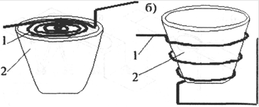 Рис. 5. Испарители прямого нагрева с тиглями с внутренним (а) и внешним (б) спиральными нагревателями 1 спираль, 2 тигель