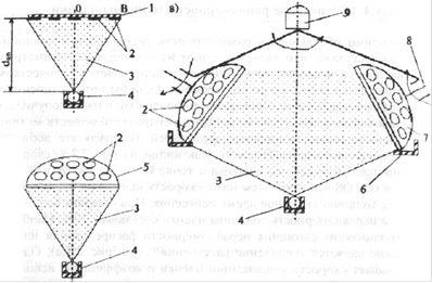 Рис. 7. Схема осаждения плёнок из точечного источника на плоский (а) и сферический (б) подложкодержатели и на планетарный подложкодержатепь с двумя направлениями вращения (в) 1, 5, 7 - плоский, сферический на планетарный подложкодержатели; 2 подложки; 3 поток осаждаемых частиц; 4 - точечный источник потока осаждаемых частиц; 6 - кольцо; 8 - ось подложкодержателя; 9 - приводная вращающаяся ось.