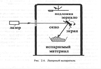 В методе лазерного испарения вещество нагревается при помощц фокусированного излучения лазера, находящегося вне вакуумной камеры. Нанесение пленок с помощью лазеров возможно благодаря следующим свойствам луча: точной фокусировке светового пятна с помощью несложных оптических систем (рис.8), высокой плотности энергии в луче (108 -1010 Дж/см2 ), достаточной для испарения любого непрозрачного материала, точной дозировке энергии излучения. Большое достоинство этого способа заключается в том, что при испарении с помощью лазерного излучения может быть разогрет только небольшой участок испаряемого вещества, что позволяет исключить загрязнения, вносимые газоотделением из разогретых частей обычных испарительных систем.