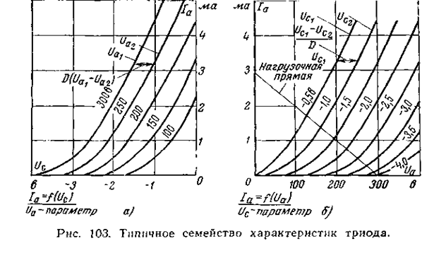 Согласно уравнению (5) триод характеризуется двумя семействами характеристик: Iа =f(Uc )с параметром Ua (рис. 4.2,а) и Ia = f(Uа ) с параметром Uc (рис. 2,в). Уравнение динамической характеристики. Для исключения сеточных токов триоды (кроме генераторных триодов) обычно работают при отрицательном напряжении на сетке. При этом «рабочая точка» лампы за счет отрицательного напряжения (смещения) на сетке смещается в область отрицательных сеточных напряжений настолько, чтобы при максимальном ожидаемом управляющем напряжении на сетке последняя находилась под отрицательным потенциалом. При подаче управляющего напряжения на сетку изменяется не только анодный ток, но и анодное напряжение (благодаря наличию внешней цепи), которое в свою очередь влияет на анодный ток. Поэтому общее изменение анодного тока (при небольших амплитудах управляющего напряжения) равно полному дифференциалу dl а , причем