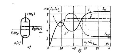 Рис. 4. Расположение электродов (а) и типичные характеристики тетрода (б).