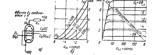 Рис. 5. Расположение электродов (а) и типичное семейство характеристик (б) пентода.