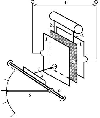 У электростатических преобразователей с изменяющимся расстоянием между пластинами (рисунок 6,б) неподвижная часть образована двумя пластинами 1, между которыми находится подвешенная на тонких неупругих металлических подвесах 2 подвижная пластина 3, гальванически соединенная с одной из неподвижных пластин и изолированная от другой. При подаче на подвижную и изолированную неподвижную пластины измеряемого напряжения подвижная пластина будет притягиваться к разноименно заряженной изолированной неподвижной пластине и одновременно отталкиваться от одноименно заряженной неподвижной пластины (независимо от полярности подключения измеряемого напряжения). Через тягу 7 и мостик 4 перемещение подвижной пластины вызывает поворот оси 6 с закрепленной на ней стрелкой 5. При этом возникает противодействующий момент, создаваемый массой подвижной пластины. Установившееся показание стрелки будет при равенстве вращающего и противодействующего моментов. Вольтметры с такими преобразователями требуют первоначальной установки в такое положение, при котором стрелка будет находиться на нулевой отметке (при отсутствии измеряемого напряжения).