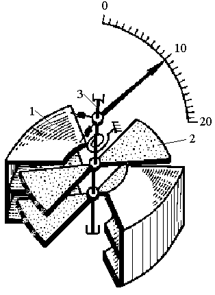 Подвижная часть преобразователя с изменяющейся активной площадью пластин (см. рисунок 6,а) состоит из одной или нескольких тонких алюминиевых пластин 2, закрепленных на оси 3. Неподвижная часть образуется одной или несколькими камерами 1, состоящими из металлических пластин с воздушным зазором между ними. Увеличение числа камер и лучей у подвижных пластин приводит к повышению чувствительности преобразователя. Форма подвижных и неподвижных пластин выбирается или рассчитывается исходя из необходимости обеспечения равномерного характера шкалы прибора. При подаче на подвижные и неподвижные пластины измеряемого напряжения они окажутся заряженными разноименными зарядами и между ними возникнут силы электростатического притяжения, в результате действия которых подвижные пластины будут поворачиваться, стремясь зайти внутрь камер. Вместе с подвижными пластинами будет поворачиваться и ось 3 с закрепленной на ней стрелкой отсчетного устройства. При этом будут закручиваться упругие элементы, создающие противодействующий момент. Подвижная часть остановится при равенстве вращающего и противодействующего моментов. Значение измеряемого напряжения будет определяться углом отклонения стрелки относительно начала шкалы. Для успокоения подвижной части в электростатических преобразователях используются магнитоиндукционные или крыльчатые, воздушные успокоители. Вследствие того, что вращающий момент у электростатических преобразователей мал, для увеличения их чувствительности применяют крепление подвижней части на растяжках и световой отсчет. При этом уменьшаются масса и момент инерции подвижной части и улучшается характер шкалы.