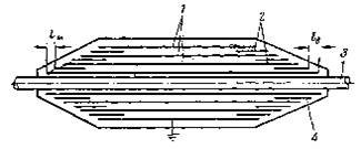1- основные уравнительные обкладки; 2 - дополнительные уравнительные обкладки; 3 -токоведущая труба; 4 - слои бумаги; 1м - длина уступа в нижней части; 1В - длина уступа.