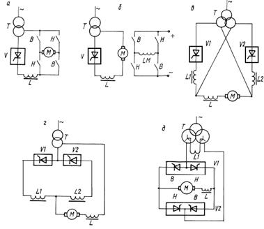 Для быстродействующих систем управления применяют схемы с двумя вентильными группами: встречно-паралельного включения вентильных групп V1 и V2 , каждая из которых питается от отдельной вторичной обмотке трансформатора Т.: в практике эта схема получила название перекрёстной (рис. 1.1, в) встречно-паралельного включения вентильных групп V1 и V2 с питанием от трансформатора Т с одним комплектом вторичных обмоток (рис. 1.1, г); Н – схема, в которой две группы вентилей, обозначенные буквой В и присоединённые к двум комплектам вторичных обмоток трансформатора, обеспечивают полярность выпрямленного напряжения одного звена, а две группы вентилей, обозначенные буквой Н – полярность выпрямленного напряжения другого знака (рис. 1.1, д). На всех схемах L – сглаживающий дроссель, L1 , L2 – уравнительные дроссели.
