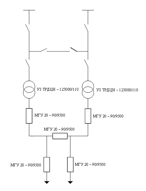 Если I > 5000 А, то в цепях силовых трансформаторов и секционного выключателя устанавливают выключатели серии МГУ-20 или другого типа. В этом случае РУ намечается закрытого типа (ЗРУ) с установкой в цепях отходящих линий шкафов КРУ.
