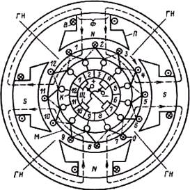 Рис. 1. Поперечный разрез машины постоянного тока с кольцевой обмоткой якоря