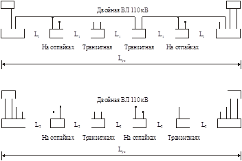 Расположение тяговых подстанций для выбранных вариантов поясняется схемой, приведенной на рис. 1. На схеме указаны расстояния между подстанциями и их тип (опорная, отпаечная, транзитная).