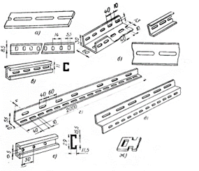 Из типовых профилей изготовляют рамы и каркасы для сборки щитков и пусковых устройств, для подвески собранных в блоки светильников и для крепления труб, проводов и кабелей. Применение монтажного профиля с закладной гайкой создает весьма удобный вид крепления труб, кабелей, аппаратов без подготовки отверстий при изменении мест крепления. Из перфорированной полосы легко изготовить планки, скобы, траверсы. Полосы с пряжками облегчают закрепление труб или кабелей привязкой. Эти пряжки имеют вырезы для закрепления в перфорации полосы и прямоугольные отверстия для полосок, крепящих кабели или трубы.