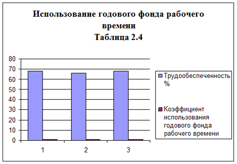 Трудообеспеченность в 2002 и 2004 году составила 68%, а в 2003 году 63%. Численность временных колхозных работников не снижается.100% использования фонда рабочего времени наблюдается в 2004 году, по составленным годам коэффициент перешагнул 100% барьер. Нормативный фонд рабочего времени был перерасходован в 2004 году. В 2003 и 2004гг, часам наблюдается перерасход вследствие сверхурочной работы.