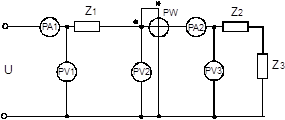В электрической цепи (рис.2) произвели полную компенсацию реактивной мощности. На основании показаний каких приборов можно сделать такое заключение? Объясните это при помощи векторных диаграмм и с физической точки зрения.