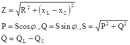 5. Вычисление полного сопротивления цепи Z и катушки ZL , активного R, индуктивного XL и емкостного XC сопротивлений, индуктивности L и емкости С, падения напряжения на индуктивности UL и коэффициента мощности cosj производить по формулам: