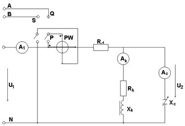 Собрать электрическую цепь согласно схеме (рис.2). Для измерения напряжения предусмотреть вольтметр со свободными концами. В схеме катушка (сопротивления RК и ХК ) имитирует нагрузку, а резистор (сопротивление RЛ) - линию.