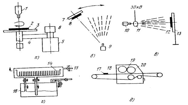 Рис.1.6. Способи нанесення фоторезистів: а - центрифугування; б - розпилення; в - електростатичне нанесення; г- занурення; д - нанесення хвилями; 1 - дозатор для подачі резиста; 2 - підкладка; 3 - столик центрифуги; 4 - привід;5 - двигун; 6 - тахометр; 7 - планшайба, що нагрівається; 8 - підкладка: 9 - форсунка подачі речиста; 10 - форсунка; 11 - кільце для зарядження резиста; 12 - підкладка; 13 – заземлена основа; 14 - підкладки: 15 - фільтроване стиснене повітря; 16 - ємність для збору резисту; 17 - підкладка; 18 - ведучий ролик; 19 - подача резиста; 20 - ролик нанесення.