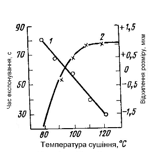 Роль першого сушіння звичайно недооцінюють, вважаючи, що на цій операції досить видалити розчинник. Що це далеко не так, особливо для позитивних резистів, можна переконатися, глянувши на рис.1.7, на якому приведена залежність від температури сушіння таких важливих параметрів, як час експонування і точність передачі розміру елемента після проявлення. Треба відзначити, що при першому сушінні коливання температури можуть досягати 10°С за рахунок недосконалості нагрівальних камер, помилок оператора, неправильної конструкції тримача підкладок. Особливо небезпечні перепади температури всередині камери і занадто швидке нагрівання.